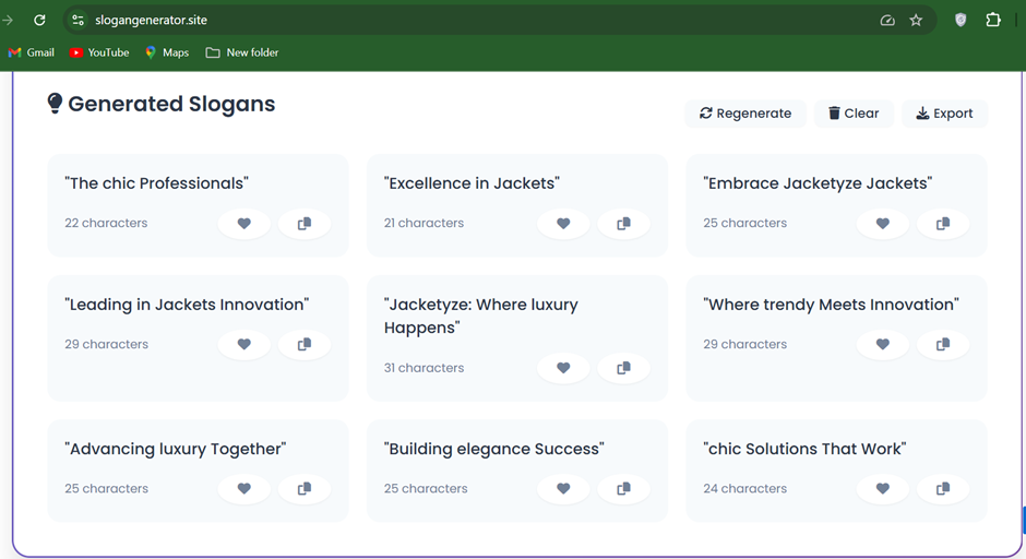 - Download & Save: Export slogans in PDF or CSV